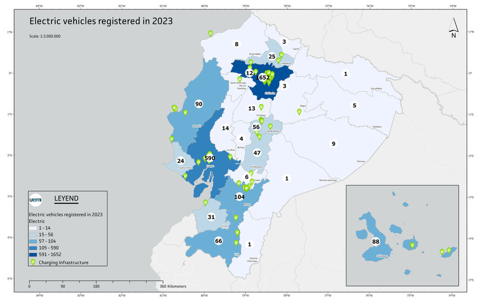As of 2022, Ecuador has 59 charging stations spread across Quito, Guayaquil, Cuenca, Loja, and the Galápagos Islands. These stations are primarily located in shopping malls, high-traffic vehicle areas, and retail shops of brands like KIA and BYD. The network includes a mix of level 1 and level 2 chargers, but only six fast chargers (>50kW) are available.